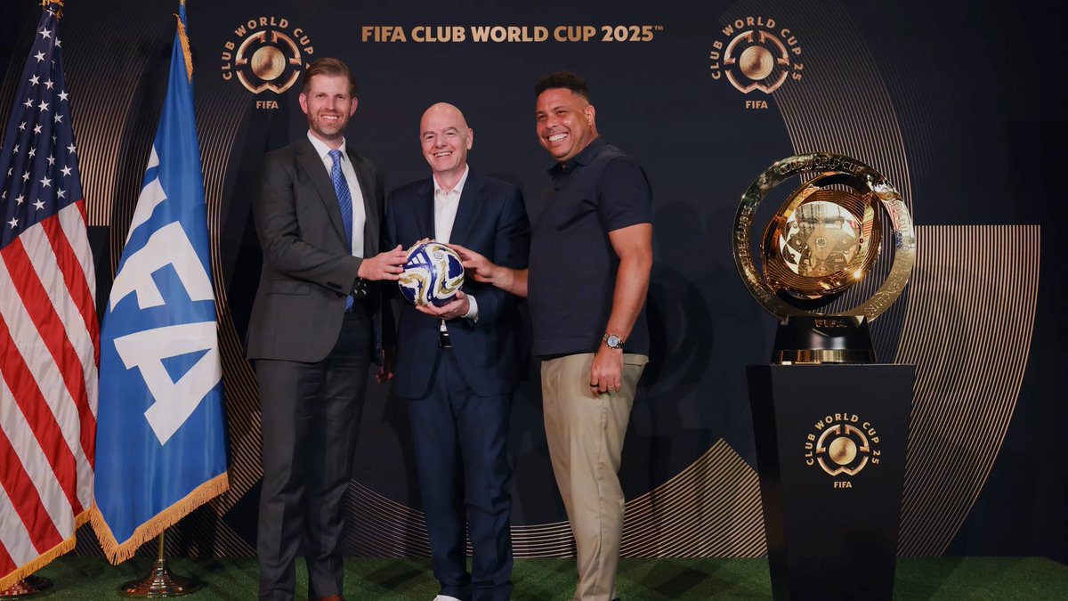 From left to right: Eric Trump, Executive VP of the Trump Organisation; FIFA President Gianni Infantino; legendary former striker Ronaldo Nazario de Lima; and the Club World Cup trophy at the new FIFA office in Trump Tower, New York City.